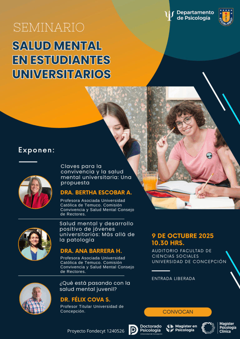 El Departamento de Psicología tiene el agrado de invitarles al seminario “Salud mental en estudiantes universitarios”. La actividad contará con la participación de las psicólogas que forman parte de la Comisión Convivencia y Salud Mental del Consejo de Rectores, Dra. Bertha Escobar y Dra. Ana Barrera, junto a ellas también expondrá el Profesor Titular de la Universidad de Concepción perteneciente a nuestro Departamento, Dr. Félix Cova.