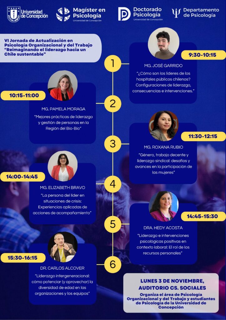 El próximo lunes 3 de noviembre 2025, en el Auditorio de Ciencias Sociales de nuestra casa de estudios, se llevará a cabo la VI Jornada de Psicología Organizacional y del Trabajo de la Universidad de Concepción denominada “Liderar con sentido de futuro: Reimaginando el liderazgo hacia un Chile sustentable”. A partir de las 9.00 de la mañana, en formato presencial y virtual, la jornada contará con la participación de Dra. Hedy Acosta, Dr. Carlos Alcove, Mg. Elizabeth Bravo, Mg. José Garrido, Mg. Pamela Moraga y Mg. Pamela Rubio.