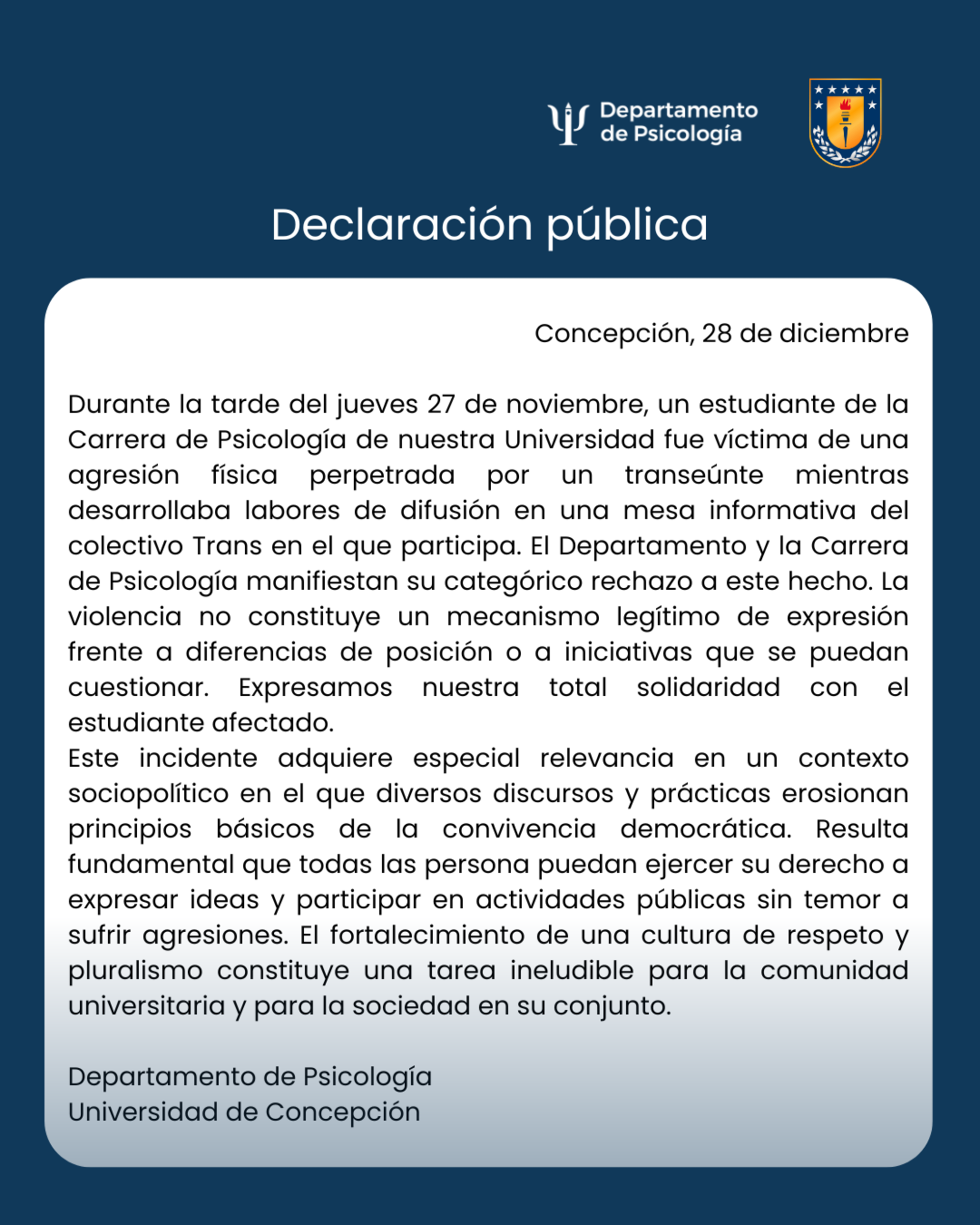 El día 3 de noviembre, en el Auditorio de la Facultad de Ciencias Sociales de nuestra casa de estudios, se llevó a cabo la VI Jornada de Psicología del Trabajo y de las Organizaciones: “Liderar con sentido de futuro: Reimaginando el liderazgo hacia un Chile sustentable”, organizado por el Área Psicología Organizacional y del Trabajo del Departamento de Psicología y estudiantes de la Carrera de Psicología, ambos de la Universidad de Concepción.
